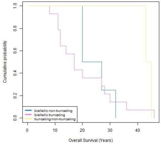 In Figure 4 we report the survival curve of 20 patients carrying bi-allelic truncating (n = 14), bi-allelic non-truncating (n = 4) and compound truncating/non-truncating bi-allelic variants (n = 2). The figure shows that patients with truncating variants have a longer life expectancy (>40 years), than those with non-truncating variants (30–40 years). It is therefore possible to assume that heterozygotes for truncating variants may be asymptomatic for most of their lives. The small number of patients with mixed bi-allelic variants—truncating/non-truncating—does not allow for any comment.