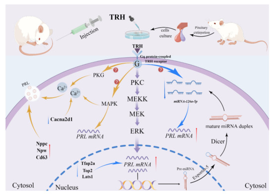 Zhao, G.-K.; Zheng, Y.; Guo, H.-X.; Wang, H.-Q.; Ji, Z.-H.; Wang, T.; Yu, S.; Zhang, J.-B.; Yuan, B.; Ren, W.-Z. TRH Regulates the Synthesis and Secretion of Prolactin in Rats with Adenohypophysis through the Differential Expression of miR-126a-5p. Int. J. Mol. Sci. 2022, 23, 15914. https://doi.org/10.3390/ijms232415914