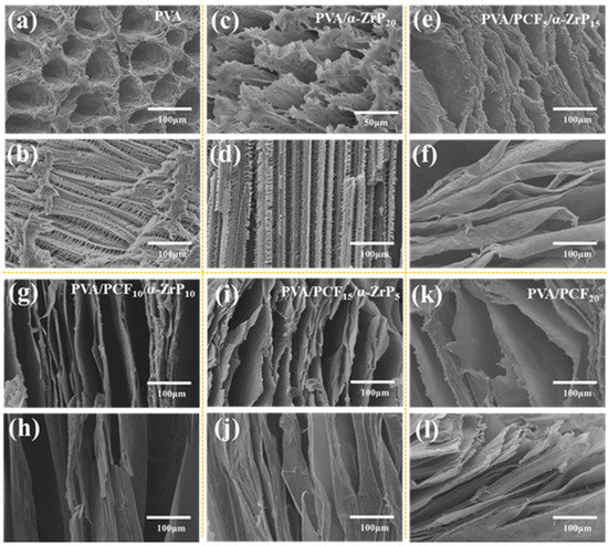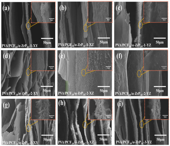 2.4.1. Formation and Structure of the Multi-Directional PVA/PCF10/α-ZrP10-x Aerogels