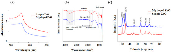 (a) UV-vis analysis, (b) FTIR analysis, and (c) XRD analysis of bare and Mg-doped ZnO NPs.