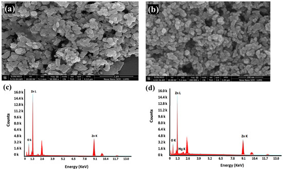 The morphology of the bare and Mg-doped ZnO NPs is presented in Figure 2. The average particle size was calculated using Image J software. Hexagonal-shaped ZnO NPs and Mg-doped ZnO NPs were obtained with particle sizes of 25.87 nm diameter ± 3.64 and 22.37 nm ± 2.07, respectively (Figure 2a,b). This clearly showed a decrease in particle size due to doping. The particles were not monodispersed and were agglomerated. The EDX analysis of the bare and Mg-doped ZnO NPs showed significant peaks of Mg, Zn, and O, hence confirming the successful doping of Mg in the ZnO crystal lattice (Figure 2c,d).