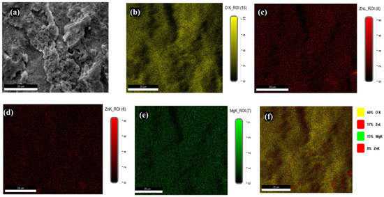 The morphological studies presented the distribution of Mg-doped ZnO NPs throughout the fabricated composite (Figure 3a–f). In the composite composition map, O, Zn, and Mg appeared in yellow (Figure 3b), red (Figure 3c,d), and green (Figure 3e), respectively. The elemental overlap is shown in Figure 3f.