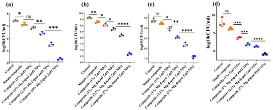 Antibacterial effect of composites with bare and Mg-doped ZnO NPs against (a) S. mutans, (b) E. faecalis, (c) saliva-derived microcosm, and (d) diabetic microcosm. p-value < 0.05 is flagged with one star (*), while (**) means p-value < 0.01, (***) represents a p-value < 0.001 and (****) shows p value < 0.0001. ns (not significant) represents statistically insignificance.