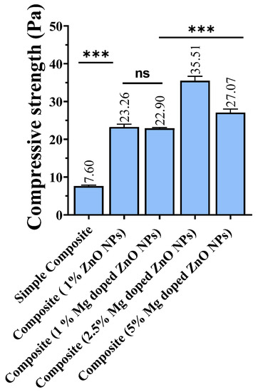 Compressive strength of composites with bare and Mg-doped ZnO NPs at varying concentrations. p-value < 0.001 is flagged with three stars (***), while ns (not significant) represents statistically insignificance.