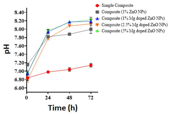The pH change upon immersion of composites fabricated with bare and Mg-doped ZnO is presented in Figure 6. Fabrication of composites with 1% Mg-doped ZnO NPs showed a significant increase in pH when compared with composites with 1% ZnO NPs at all immersion times. The greatest pH change at all immersion times was observed for composites with 5% Mg-doped ZnO NPs.
