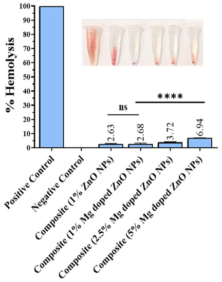 % Hemolysis of composites with bare and Mg-doped ZnO NPs at varying concentrations. p-value < 0.0001 is flagged with four stars (****), while ns (not significant) represents statistically insignificance.