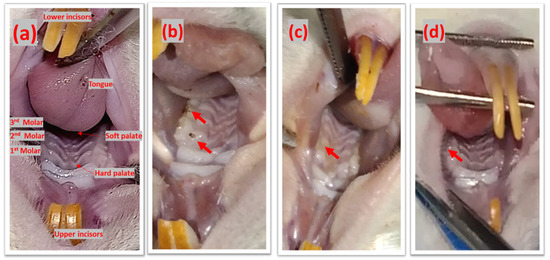 (a) Mouth oral cavity, secondary caries assessment, red arrows showing (b) marginal caries adjacent to simple composite, (c) visual changes in the enamel around the composite with ZnO, and (d) sound tooth surface around the restoration composite with Mg-doped ZnO.