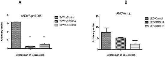 Samples of mRNA were prepared in triplicates from two independent cell culture experiments and RT-PCR was performed using the MMLV kit from Invitrogen. The expression of STOX1-A or B was then assessed by qRT-PCR. The cells and their detailed preparation and selection were published previously [,]. They were all cultivated in an adequate medium complemented with Geneticin G-418 at 500 µg/mL []. BeWo-A and BeWo-B overexpressed STOX1-A and STOX1-B (20 and 6-fold, respectively), and BeWo-C was their related control (with the empty G-418 resistance plasmid). For JEG-3 cells, AA6 (JEG-3A) overexpressed STOX1-A (~30 fold), B10 (JEG-3B) overexpressed STOX1-B (~4–6 fold), and BD3 (JEG-3C) was the related control cell line.