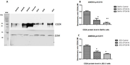 Western blot analyses of the CD24 expression in STOX1-A/B-stably transfected BeWo and JEG-3 cells. (A) Western blot analysis of the CD24 protein expression in trophoblast cell transfectants by STOX1-A/B and mock control of BeWo cells and of JEG-3 cells. CD24 was analyzed by Western blotting with a specific anti-CD24 monoclonal antibody (upper panel). Βeta2-microglobulin was used as a control for loading equal amounts of proteins on the gel (lower panel). (B,C) Semiquantitative densitometric assessment of CD24 and Β2-microglobulin bands was performed using ImageJ software. The data represents density at two exposure time points. The intensity of the CD24 bands was normalized to β2-microglobulin as a control for the equal loading of proteins. The results have a similar pattern in three different repeats. The statistic is based on one-way ANOVA followed by a post hoc test: Student–Neumann–Keuls. The stars were obtained by comparing controls vs. STOX1-A and STOX1-B, separately (* p < 0.05 and ** p < 0.01). The figure is representative of the Western blot experiments that were conducted three times and showed a similar pattern of CD24 reduction. The histogram error bars are SEM.