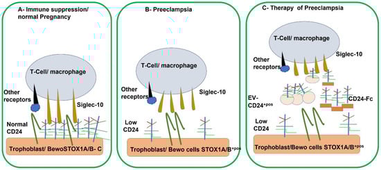 A schematic model of the potential role of CD24 in a normal and in preeclampsia is depicted to indicate how CD24 replenishment could help fighting preeclampsia. (A) In normal pregnancy, the immunosuppressive process involves the formation of a complex made of CD24, Siglec-10 and the control STOX1 A/B (STOX1-A/B—C) on the surface of BeWo/trophoblast cells. The complex triggers the inhibitory signals and promotes immunosuppression. (B) in preeclampsia there is a reduced amount of CD24-Siglec 10 due to the over expression of the mutated variants of sTOX1 A/B on the surface of the BeWo cells, leading to the loss of immune suppression. (C) When replenishment the cultured cells with extracellular vesicles (EV) that have a rich expression of CD24 on their surface, (EV-CD24+pos) or with CD24-Fc soluble molecule, the BeWo/trophoblast regain immune tolerance and recover from preeclampsia.