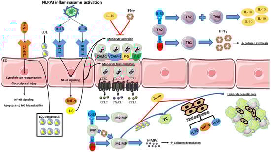 Moving downstream in the NLRP3 inflammasome pathway, IL-1 is a major mediator of inflammation in various pathologic states, such as autoinflammatory diseases (familial Mediterranean fever), acute infections, and chronic inflammatory environments, such as cancer and atherosclerosis [31]. In the latter, it promotes its initiation by activating the vascular endothelium, with subsequent upregulation of adhesion molecules, mobilization and transmigration of leukocytes [32]. IL-1 is also produced by cells found in the atheroma following inflammatory stimuli, and, thus, its role in atherogenesis progression was assumed and later demonstrated in animal studies [33,34]. This was accomplished via pharmaceutically or genetically augmenting or limiting IL-1 function. In pig models, IL-1β caused the thickening of the intima of coronary arteries and vasospasm in vivo [35]. Furthermore, IL-1 causes the autocrine production of platelet-derived growth factor (PDGF), which, in turn, stimulates human VSMC proliferation. Besides VSMCs, IL-1 modulates cardiac myocyte functionality and may hinder cardiac contractility and remodeling post-myocardial infarction. IL-1 can also act on endothelial cells, leukocytes, and VSMC to potentiate the production of inflammatory mediators (IL-6, TNF-α, CCL2), potentiating its anti-inflammatory effect. Ultimately, molecules that are responsible for plaque remodeling (MMP-3), erosion (MMP-2, -9), and rupture (MMP-1, -8, -13) are upregulated [36].