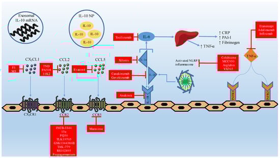 IL-6 is a pleiotropic cytokine that resides downstream in the IL-1 signaling cascade, is involved in the innate and adaptive immunity system, and modulates the acute-phase response and chronic inflammation. It is mostly produced after IL-1 or TNF-α triggers activated monocytes and macrophages, as well as other cell types, such as SMCs, endothelial cells, adipocytes, fibroblasts, and T helper 2 cells [79]. IL-6 increases the formation of acute phase reactants such fibrinogen, plasminogen activator inhibitor, which prevents fibrinolysis, and CRP by binding to membrane-bound IL-6 receptors (IL-6R) on hepatocytes in the classical signaling pathway [80]. The IL-6/IL-6R complex then binds to the two subunits of the membrane-bound gp130, forming a hexamer and promoting intracellular signaling [80]. Even though most cells do not express IL-6R on their membrane and cannot respond to IL-6 stimulation, endothelial cells represent an exception to this rule, together with lymphocytes, macrophages, and hepatocytes. IL-6 can also bind to soluble IL-6R in tissues and serum, allowing signaling in most cell types (trans-signaling) [80]. The production of soluble IL-6R is based on the cleavage of membrane-bound IL-6 by ADAM10 (a disintegrin and metalloproteinase domain-containing protein 10) and ADAM17 [81]. Recently, a third signaling method has been described, based on the interaction between dendritic cells and T cells (trans-presentation) [82]. After binding to gp130, the intracellular Janus kinase/Signal transducer and activator of transcription 3 (JAK/STAT3) signaling pathway is activated, ultimately leading to specific gene expression. As a contributor to inflammation, IL-6 is implicated in the pathogenesis of related diseases, such as rheumatoid arthritis, solid organ and hematologic malignancies [83].