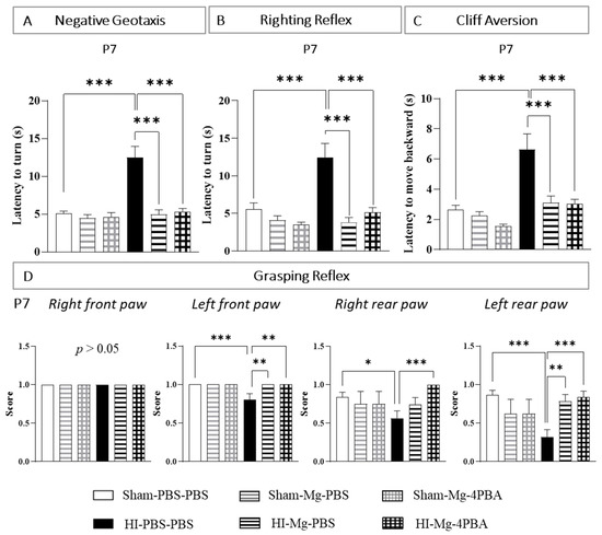 Effects of the neonatal HI, MgSO4 or of the MgSO4/4-PBA association on pups’ performances in the negative geotaxis (A), righting reflex (B), cliff aversion (C) and grasping reflex (D) tests at P7. Data are expressed as the latency (s) to turn (A,B) and to move backward (C), or as the presence or absence of the grasping reflex for each paw (score: 0 when reflex is absent, 1 when reflex is observed). (D) Sexes are pooled. Data are expressed as M ± S.E.M. n = 10–30 pups/group. Two-way ANOVA was performed followed by Tukey’s post-test. For grasping test, the Kruskal–Wallis test was performed followed by Dunn’s post-test. (* p < 0.05, ** p < 0.01, *** p < 0.001).