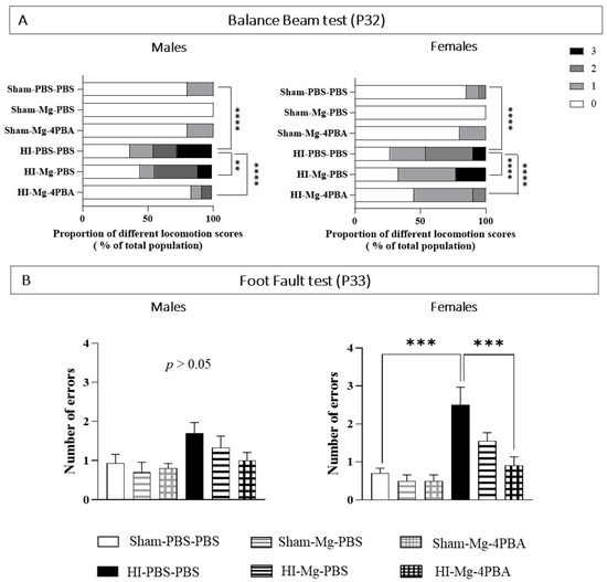 For the balance beam test (Figure 2A), Chi2 tests revealed a significant effect of HI and treatments in adolescent mice. Concerning the locomotion score of the balance beam test, in both male and female mice, neither MgSO4 nor the MgSO4/4-PBA association induced deleterious proper effects. HI increases high locomotion scores, reflecting an altered motor coordination compared with Sham mice (Males: Chi2 HI-PBS–PBS vs. Sham-PBS–PBS, df: 61.79, 3; ****, p < 0.0001; females: Chi2 HI-PBS–PBS vs. Sham-PBS–PBS, df: 62.33, 3, ****, p < 0.0001). MgSO4 in HI males partially prevents the HI-induced motor deficits (Chi2 HI-Mg–PBS vs. HI-PBS–PBS, df: 13.64, 3; **, p = 0.0034) by limiting the emergence of high locomotion scores. In HI females, MgSO4 partially prevents the HI-induced motor deficits (Chi2 HI-Mg–PBS vs. HI-PBS–PBS, df: 45.79, 3, ****, p < 0.0001,) by reducing light locomotion scores. In each sex, the MgSO4/4-PBA association totally prevents the HI effect (males: Chi2 HI-Mg–4-PBA vs. HI-PBS–PBS, 53.26, 3; ****, p < 0.0001; Chi2 HI-Mg–4-PBA vs. Sham-PBS–PBS, ns, p > 0.05; females: Chi2 HI-Mg-4PBS vs. HI-PBS–PBS, df: 33.70, 3, ****, p < 0.0001; Chi2 HI-Mg–4-PBA vs. Sham-PBS–PBS, ns, p > 0.05).