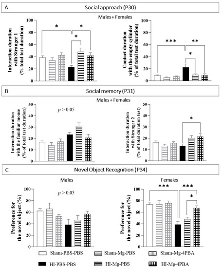 Effects of neonatal HI, MgSO4 or of the MgSO4/4-PBA association on cognitive capacities in adolescent male and female mice. (A)—Interaction duration with Stranger 1 and contact duration with the empty cylinder (% of total test duration) were measured with the social approach test at P30. n = 6–16 mice/group. Sexes are pooled. (B)—Interaction duration with the familiar mouse and interaction duration with Stranger 2 (% of total test duration) were measured with the social memory test, performed at P31. n = 6–16 mice/group. Sexes are grouped. (C)—Percentage of preference for the novel object at P34. n = 5–14 males and 5-20 females/group. Data are expressed as M ± S.E.M. Two-way ANOVA was performed followed by Tukey’s post-test (* p < 0.05, ** p < 0.01, *** p < 0.001).