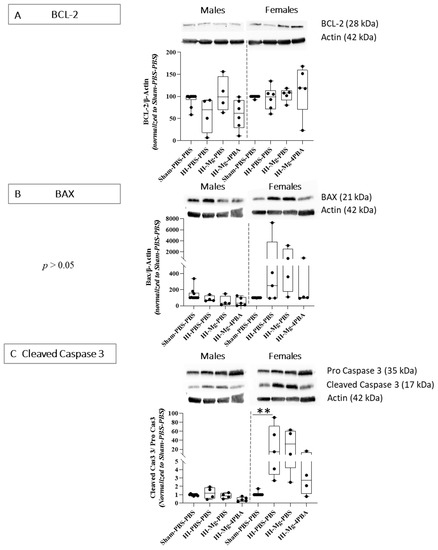 Effects of the neonatal HI, MgSO4 or of the MgSO4/4-PBA association on mitochondrial apoptotic proteins expression at P6. (A)—BCL-2 protein level 24 h after surgery. (B)—BAX protein level 24 h after surgery. (C)—Ratio of cleaved caspase 3 protein level over pro-caspase 3 protein level 24 h surgery. Data were normalized to the Sham-PBS–PBS group and expressed as median with min and max values, n = 4–10 males/group; 4–9 females/group. The Kruskal–Wallis test was performed followed by Dunn’s post hoc test (** p < 0.01).