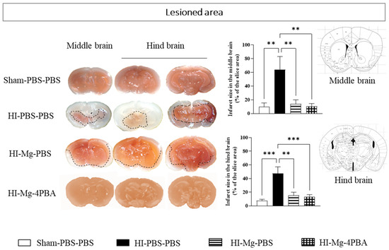 2.5. In P10 Pups, HI Induces a Massive Tissue Loss That Is Completely Prevented by MgSO4 and by the MgSO4/4-PBA Association