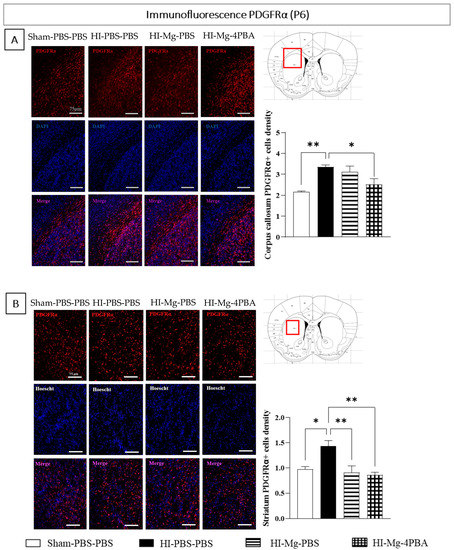 Concerning the PDGFRα+ cell density in the corpus callosum, a one-way ANOVA revealed a difference between groups (Figure 6A, F = 7.949, p = 0.0016). Tukey’s post hoc test indicated that neonatal HI increases the PDGFRα+ cell density in the corpus callosum (vs. Sham-PBS–PBS; p = 0.0018, +44%). On this parameter, only the MgSO4/4-PBA association counters the HI effect (vs. HI-PBS–PBS; p = 0.0238, −20%).