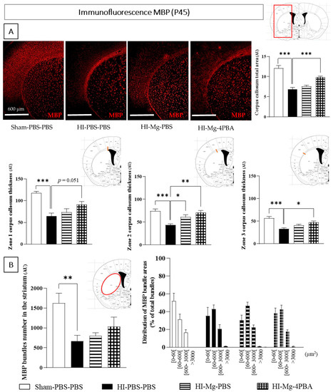 Effects of neonatal HI, MgSO4 or of the MgSO4/4-PBA association on myelin integrity (MBP) in the corpus callosum and the striatum of ipsilateral hemisphere, at P45. (A)—MBP labeling immunofluorescence and quantification of corpus callosum area and thickness in 3 zones containing axons that projects to the motor cortex (Zone 1), sensory cortex (Zone 2) and auditory cortex (Zone 3); AU: Arbitrary unit. (B)—Quantification MBP bundles number in the striatum and distribution of bundles sizes (µm2). Sexes are pooled. Data are expressed as M ± S.E.M, n = 5–6 pups/group. One-way ANOVA was performed followed by Tukey’s post-test (* p < 0.05, ** p < 0.01, *** p < 0.001). For bundle distribution, two-way ANOVA was performed; no significant result was obtained.