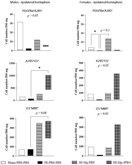 In contrast, in females, concerning PDGFRα+A2B5+ cells, the Kruskal–Wallis test revealed a difference between groups (p = 0.0456). Dunn’s post hoc test shows that HI females display a decrease in PDGFRα+A2B5+ cell number compared with Sham females (vs. HI-PBS–PBS, p = 0.0165; −91%). Only MgSO4 in HI females tends to increase the PDGFRα+ A2B5+ cell number (vs. HI-PBS–PBS; p = 0.1, +175%). For the A2B5+O1+ and O1+MBP+ cell number, the Kruskal–Wallis test did not reveal any difference between groups (p = 0.0856 and p = 0.0848).