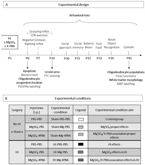 In the present study, using the Rice–Vannucci model on P5 pups, we address whether (i) 4-PBA alters MgSO4 neuroprotective effects at short term; (ii) the MgSO4/4-PBA association improves MgSO4 long-term effects; (iii) the MgSO4/4-PBA association promotes OL differentiation; and (iv) the MgSO4/4-PBA association presents deleterious proper effects. Moreover, sex-dependent effects were systematically investigated.