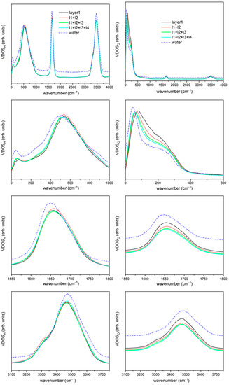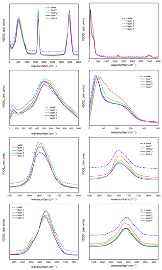 The VDOS spectra calculated using Equation (2) for each of the solvation layers close to the surface are shown Figure 2 together with the spectrum of liquid water simulated using the Ferguson water model [28].
