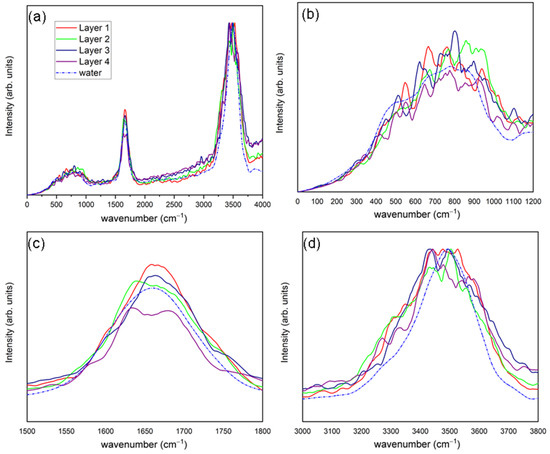 We decomposed the low-frequency area in two parts—a first where peaks are absent from all spectral profiles at frequencies lower than 130 cm−1, and a second where the principal libration-rotational components appear for the presently used water model at frequencies up to ~1300 cm−1. It can be seen how the first three solvation layers are wider than the fourth (which has a width similar to that of liquid water). This may be related to the fact that these three layers adopt a hybrid shape between restricted-movement water (i.e., confined water or bonded water) and liquid water. This behaviour has been previously observed for the layer closest to the HEWL protein [28].