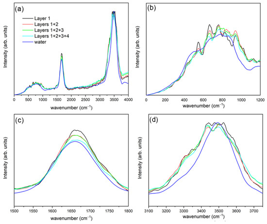 In the H-O-H bending-vibration region, the position of the bending-band centre displays a blue-shift as we move away from the protein. In the case of the first layer, this position is close to 1675 cm−1, whilst for the other three, it moves towards 1650 cm−1, This peak is related to the H-O-H bending vibration for liquid water. In addition, a shoulder appears at 1730 cm−1 in the first layer and starts to decrease as we add more solvation layers. This band and peak movement is related to a transition between low-mobility water molecules, via confinement or hydrogen bond interaction with the protein amino-acids towards a bulk-type liquid water [28,35]. For the last vibrational region considered, in the O-H-stretching band, the behaviour is quite like that of each of the separate layers. The 3300 cm−1 shoulder is located clearly, and there is a small decrease in the intensity, as we consider yet more solvation water molecules in this particular layer.