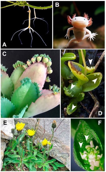 Animals able to regenerate lost body organs in vivo: (A) Hydra vulgare, an aquatic invertebrate (©Warren Photographic, www.warrenphotographic.co.uk/05836-common-hydra-budding; accessed on 11 October 2022). (B) Mexican axolotl (Ambystoma mexicanum), an aquatic salamander (©Warren Photographic, www.warrenphotographic.co.uk/00108-albino-axolotl; accessed on 11 October 2022). Examples of plants with natural epiphylly: (C) Kalanchoe laetivirens. (D) Malaxis paludosa (Michael Dodd’s photo, Open University, Milton Keynes, UK). The white arrowheads indicate the propagules. (E) Hieracium alpinum, a species of Asteraceae with an apomictic triploid cytotype in vivo (Mauro Felicioli’s photo, www.actaplantarum.org/flora/flora_info.php?id=506593; accessed on 11 October 2022). (F) An unusual example of a plant with epiphyllous embryos induced in vitro: the interspecific hybrid EMB-2 (Helianthus annuus x H. tuberosus). The white arrowheads indicate the somatic embryos.