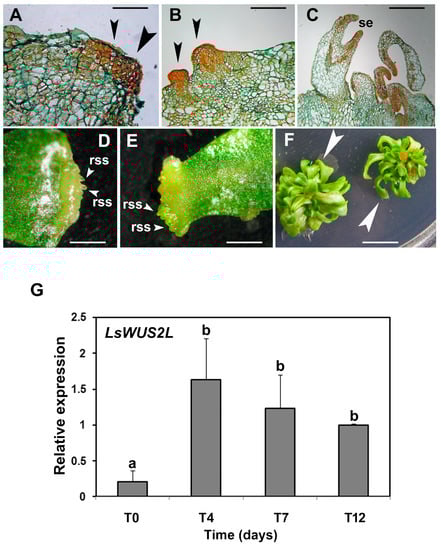 In vitro regeneration of Lactuca sativa cv. ‘Romana’ on a regeneration medium with 2.2 μM of 6-benzylaminopurine and 0.54 μM of α-naphthalenacetic acid; time-dependent analysis of WUSCHEL2-LIKE (LsWUS2L) expression levels. (A–C): Histological analysis of cotyledon explants cultivated in vitro. Explants sectioned after 4 [T4 (A)], 7 [T7 (B)], and 12 [T12 (C)] days of culture on the regeneration medium. (A) Longitudinal section of a callus area characterized by small and poorly vacuolated cells located in a marginal region (black arrowheads). (B). Longitudinal section of an explant with initial stages of adventitious structures (black arrowheads). (C). Longitudinal section of an explant with early-stage somatic embryos (se). Scale bars: 0.7 mm (A), 0.19 mm (B), 0.28 mm (C). Binocular microscope photos of cotyledon explants in regeneration. (D), (E) Explants after 7 days (T7) of culture on regeneration medium: regeneration events occurred with the appearance of round-shaped structures (rss, white arrowheads) characterized by a regular profile. (F) Explants with massive formation of well-organized regenerated plantlets (white arrowheads). Scale bars: 0.85 mm (D), 1.02 mm (E), 8.7 mm (F). (G) Time-course analysis of the expression of WUSCHEL2-LIKE (LsWUS2L) during in vitro regeneration from cotyledon explants of lettuce. The times of in vitro culture analyzed were: T0 (0 days), T4 (4 days), T7 (7 days), and T12 (12 days). The relative transcriptional values were calculated using T12 as the reference sample. Data are means ± standard deviation (SD) (n = 4). Different letters indicate statistically significant differences between genotypes (one-way ANOVA and Tukey’s test: p < 0.05) [69].