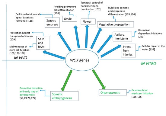In conclusion, as underlined by Jha et al. [88], WOX genes are master regulators of different aspects of plant biology and in Figure 4 a simplified overview is reported. We focused on the involvement of these genes in the in vitro regeneration of plants and, more generally, in the manifestation of cellular totipotency.