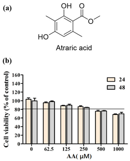 Chemical structure of atraric acid (a). The viability of different concentrations (b).
