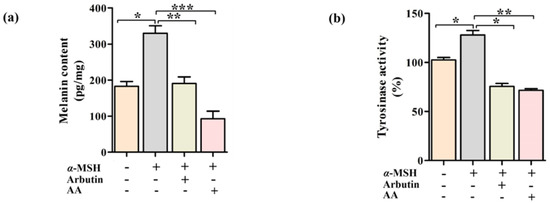 Effects of AA on cellular melanin synthesis and intracellular tyrosinase activity in α-MSH-induced PIG1 cells. Cells were treated with the indicated concentrations of AA for 24 h. The relative melanin content (a). The tyrosinase activity (b). Data are expressed as the mean ± SEM. * p < 0.05, ** p < 0.01 and *** p < 0.001 (n = 3 per group).