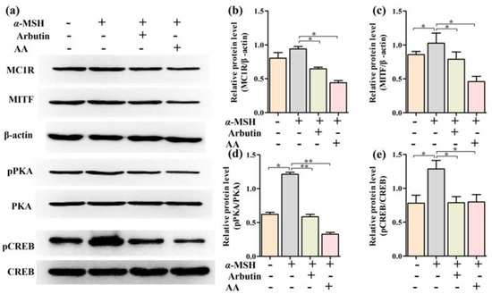 Effects of AA on the expression of MC1R, MITF, pPKA and pCREB of α-MSH-induced PIG1 cells (a). The levels of MC1R (b), MITF (c), pPKA (d) and pCREB (e) proteins were quantified by densitometry. Data are expressed as mean ± SEM. * p < 0.05, ** p < 0.01 (n = 3 per group).