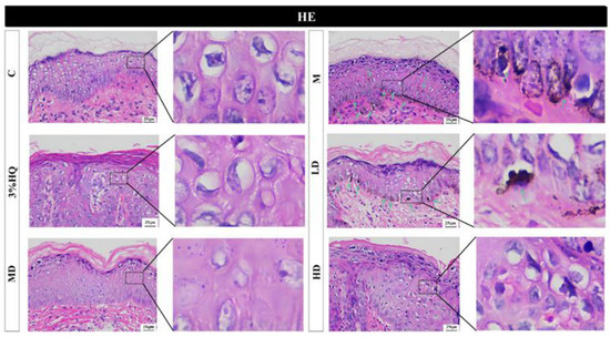 α-MSH and UVB irradiation can stimulate melanin secretion, thereby triggering melanogenesis. Therefore, to observe the effects of AA on UVB-induced hyperpigmentation in guinea pigs, H&E staining tests were conducted. As shown in Figure 5, histological analysis confirmed that AA on the DM and HM groups and 3% HQ markedly reduced pigmentation in the superficial layer of the skin (green arrows). However, it is worth noting there was an epidermal hyperplasia on the skin surface of the 3% HQ. All in all, the results above indicated that AA could effectively inhibit UVB-induced pigmentation, and the effect was better than 3% HQ.