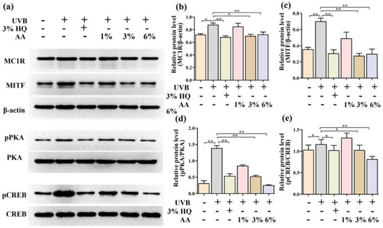 Effects of AA on the expression of MC1R, MITF, pPKA and pCREB of dorsal skin (a). The levels of MC1R (b), MITF (c), pPKA (d) and pCREB (e) proteins were quantified by densitometry. Data are expressed as mean ± SEM. * p < 0.05, ** p < 0.01 (n = 6 per group).