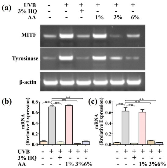 Effects of AA on the expression of mRNA of MITF and tyrosinase of dorsal skin (a). The mRNA levels of MITF (b) and tyrosinase (c) proteins were quantified by densitometry. Data are expressed as mean ± SEM. ** p < 0.01 (n = 6 per group).