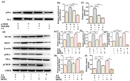 The MC1R inhibitor MSG606 was utilized to study the participation signaling pathway in AA-mediated antimelanogenesis to confirm whether the PKA/CREB/MITF pathway is implicated in the inhibition of melanogenesis by AA. We measured the melanin content in the PIG1 cells administration with α-MSH, AA and MSG606 for 24 h. As shown in Figure 8c, the PIG1 cells in the MSG606 + α-MSH group, MSG606 + α-MSH + AA group and MSG606 + AA group showed significantly lower (p < 0.01) levels of melanin in comparison to the α-MSH group. Noteworthy, co-treatment with α-MSH and AA reduced melanin content compared with that in the α-MSH + MSG606 group. The expression levels of pPKA in the different groups were consistent with the contents of melanin in the different groups (Figure 8a,b).
