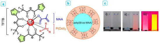 In this work, highly monodispersed poly(St-co-MAA) nanoparticles containing β-diketonate Eu3+ complexes were synthesized using the step-wise process. The chemical structure of β-diketonate Eu3+ complexes of Eu(TFTB)2(MAA)P(Oct)3 and (b) core–shell structure of Eu(TFTB)2(MAA)P(Oct)3@poly(St-co-MAA) were illustrated in Figure 1a,b. Additionally, styrene and acrylic acid for latex monomers have similar luminescence quenching problems. When a cation or anion is exposed to the europium complex, the fluorescence properties is deteriorated by a substitution reaction between the cation and Eu3+ ions. MAA is introduced with four purposes: (i) acrylic groups for further polymerization with poly(St-co-MAA) nanoparticles, (ii) carboxylic acid group for complexation of Eu3+ ions, (iii) stabilizer to avoid dissociation from ambient conditions such as temperature and ionic impurities and (iv) hydrophilic moiety extended in the aqueous media.