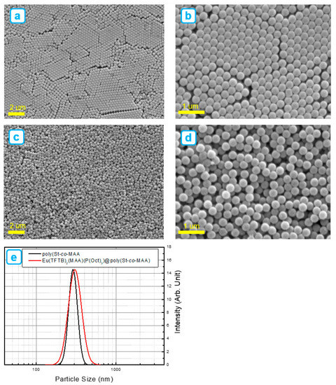 SEM images of synthesized: (a,b) polystyrene (poly(St-co-MAA) nanoparticles, (c,d) after modifying poly(St-co-MAA) nanoparticles with β-diketonate Eu3+ complexes of Eu(TFTB)2(MAA)P(Oct)3 resulting in Eu(TFTB)2(MAA)P(Oct)3@poly(St-co-MAA). (e) Particle size distributions of poly(St-co-MAA) and Eu(TFTB)2(MAA)P(Oct)3@poly(St-co-MAA) nanoparticles.