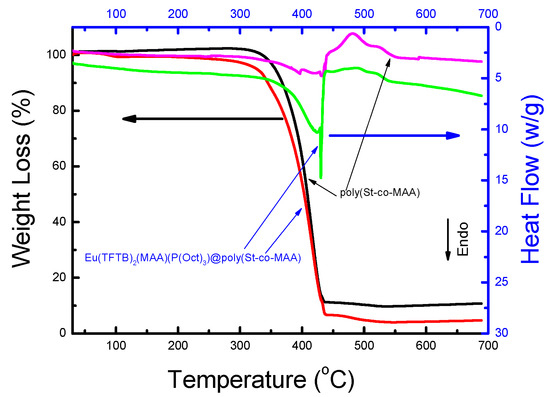 The secondary weight loss and heat flow curve of Eu(TFTB)2(MAA)P(Oct)3@poly(St-co-MAA) over the temperature range of 200 °C to 527 °C is due to the thermal decomposition of organic compounds such as MAA, TFTB and P(Oct)3. The heat of the reaction increased due to the disintegration of the β-diketonate Eu3+ complexes on poly(St-co-MAA). Eu(TFTB)2(MAA)P(Oct)3@poly(St-co-MAA) has a lower decomposition temperature than poly(St-co-MAA), which means better thermal conductivity [19]. The sharp endothermic peak in the DSC curve of Eu(TFTB)2(MAA)P(Oct)3@poly(St-co-MAA) at 430 °C can be assigned to the thermal decomposition of P(Oct)3.