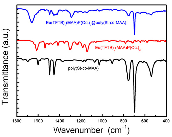 FTIR transmittance spectra of poly(St-co-MAA), Eu(TFTB)2(MAA)P(Oct)3 and Eu(TFTB)2(MAA)P(Oct)3@poly(St-co-MAA).