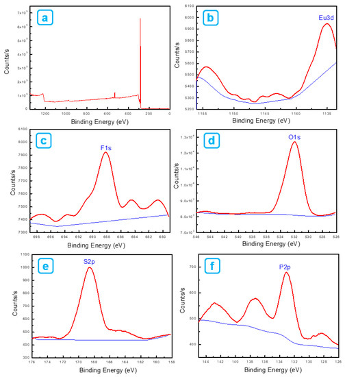 Figure 5 shows XPS survey profiles (Figure 5a) and individual elements in Eu(TFTB)2(MAA)P(Oct)3@poly(St-co-MAA). A strong signal from the C1s element is expected from poly(St-co-MAA) and β-diketonate Eu3+ complexes. Figure 5b represents the maximum position at 1135.5 eV (0.04 at%) coming from the Eu3d core-level spectrum of the β-diketonate Eu3+ complexes. The weak peak at 688.3 eV (0.51 at%) comes from the F1s core-level spectrum, which can be assigned to -CF3 in TFTB (Figure 5c). The strong peak at 532 eV (3.23 at%) indicates the presence of the core-level spectrum of O1s due to the carboxylic acid in MAA. Figure 5d,e shows the position of the maximum peak at 168.5 eV (0.56 at%) coming from the F1s core-level spectrum due to -CF3 in TFTB. The peak appeared at 133 eV (0.52 at%) from the P2p core-level spectrum (Figure 5f).