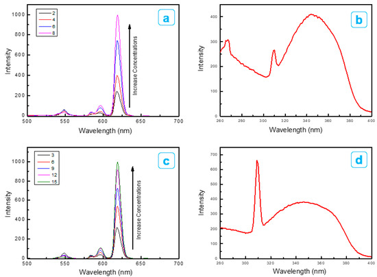 (a) Emission spectrum (λex at 350 nm) and (b) excitation spectrum (λem at 621 nm) Eu(TFTB)2(MAA)P(Oct)3 dispersed in water and (c) Emission spectra (λex at 342 nm) and (d) excitation spectrum (λem at 621 nm) at 298 K for 5D0→7Dj transition depending on different concentration of Eu(TFTB)2(MAA)P(Oct)3@poly(St-co-MAA) dispersed in water.