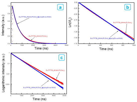 Luminescence decay curves for Eu(TFTB)2(MAA)(P(Oct)3) (red) and Eu(TFTB)2(MAA)(P(Oct)3)@poly(St-co-MAA) (blue) dispersed in water (λem = 615 nm, λex = 375 nm). Plotted with (a) time (ns) versus intensity, (b) time (ns) versus natural logarithm (I/I0) and (c) time (ns) versus logarithmic intensity.