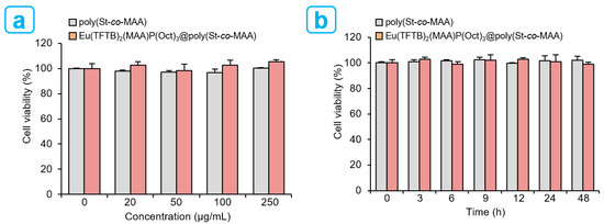 For the concentration-dependent data at 24 h, cell viability was 96.1 ± 2.75% for 20 μg/mL, 95.5 ± 2.7% for 50 μg/mL, 95.2 ± 4.5% for 100 μg/mL and 99.0 ± 1.5% for 250 μg/mL of poly(St-co-MAA)-treated HepG2 cells and 104.5 ± 9.2% for 20 μg/mL, 98.9 ± 8.8% for 50 μg/mL, 103.0 ± 7.4% for 100 μg/mL and 112.0 ± 6.5% for 250 μg/mL of Eu(TFTB)2(MAA)P(Oct)3@poly(St-co-MAA) treated HepG2 cells. At a concentration of 100 µg/mL, cell viability was 102.1 ± 2.7% for 3 h, 103.0 ± 1.6% for 6 h, 100.7 ± 5.6% for 9 h, 101.5 ± 2.3% for 12 h, 103.6 ± 5.7% for 24 h and 98.9 ± 8.8% for 48 h of poly(St-co-MAA) treated HepG2 cells and 108.9 ± 8.9% for 3 h, 104.6 ± 8.2% for 6 h, 101.1 ± 8.3% for 9 h, 107.5 ± 6.4% for 12 h 100.8 ± 8.8% for 24 h and 97.2 ± 7.6% for 48 h of Eu(TFTB)2(MAA)P(Oct)3@poly(St-co-MAA) treated HepG2 cells. Compared with the control group, the viability of HepG2 cells exposed to Eu(TFTB)2(MAA)P(Oct)3@poly(St-co-MAA) was not significantly different despite the increase in concentration from 20 to 250 µg/mL. At the dose treated as described above, poly(St-co-MAA) did not show a decrease in cell viability, and there was no significant change in cytotoxicity when cells were treated and cultured at 100 µg/mL for 24 h [30].
