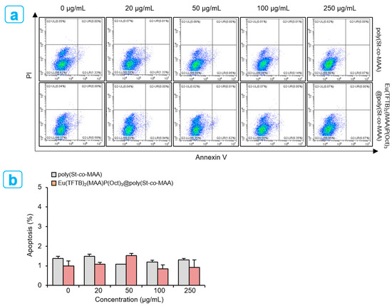 Flow cytometry assays for necrotic/apoptotic cells have benefits over traditional viability assays such as annexin V/PI, which do not provide quantitative information on dead cells. Flow cytometry facilitates accurate quantification of live, early apoptotic, late apoptotic and necrotic cells in large cell populations [31]. Concentration dependent cell viability was investigated after treating the HepG2 cells with poly(St-co-MAA) and Eu(TFTB)2(MAA)P(Oct)3@poly(St-co-MAA) and was measured by flow-cytometry-based assays. After treating the cells, Annexin-V/PI was stained as a marker for early apoptosis. Based upon the degree of uptake of Annexin-V/PI, the population of individual cells are plotted in one of the four quadrants. The cells without staining with Annexin-V are identified as non-apoptotic, non-necrotic cells (live cells). The cells stained for Annexin-V dye are early apoptotic cells (Figure 9). The synthesized poly(St-co-MAA) and Eu(TFTB)2(MAA)P(Oct)3@poly(St-co-MAA) nanoparticles were confirmed to be virtually non-toxic in terms of cytotoxicity in HepG2 cells. After 24 h of incubation, apoptosis in late-stage apoptosis were 1.48% ± 0.2% for 20 µg/mL, 1.08% ± 0.0% for 50 µg/mL, 1.20% ± 0.1% for 100 µg/mL, 1.31% ± 0.1% for 250 µg/mL of poly(St-co-MAA) treated HepG2 cells, respectively, and 1.08% ± 0.7% for 20 µg /mL, 1.52% ± 0.2% for 50 µg/mL, 0.84% ± 0.3% for 100 µg/mL, 0.91% ± 0.7% for 250 µg/mL of Eu(TFTB)2(MAA)P(Oct)3@poly(St-co-MAA) treated HepG2 cells, respectively. Consequently, cell-specific fluorescence of Eu(TFTB)2(MAA)P(Oct)3@poly(St-co-MAA) indicated that the particle dynamics of Eu(TFTB)2(MAA)P(Oct)3@poly(St-co-MAA) undergo endocytosis. There are fewer early apoptotic, late apoptotic and necrotic cells in each sample, regardless of culture period compared with live cells.