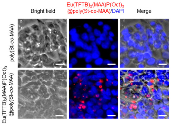 Fluorescence images of intracellular uptake and trafficking of poly(St-co-MAA) and Eu(TFTB)2(MAA)P(Oct)3@poly(St-co-MAA) in HepG2 cells. Nuclei were stained with DAPI (blue). Scale bar, 20 µm.