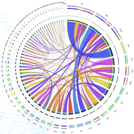 - Krzywinski, M.; Schein, J.; Birol, I.; Connors, J.; Gascoyne, R.; Horsman, D.; Jones, S.J.; Marra, M.A. Circos: An information aesthetic for comparative genomics. Genome Res. 2009, 19, 1639–1645. [Google Scholar] [CrossRef] [PubMed]