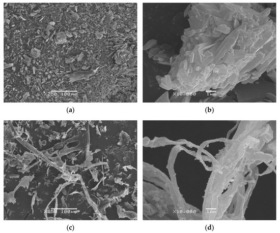 Figure 3a,b presents the morphology of DHQR under 250× and 10,000× magnifications, respectively. It can be characterized as a fine powder in which units are agglomerates. It consists of many particles that are irregular in shape. The mean diameter of agglomerates was 11.234 ± 3.215 µm.